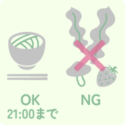 検査前日の夕食は、うどんやおかゆ、具の入っていないスープなど、脂肪分や食物繊維の少ない食事にしてください。脂肪分の多い肉や揚げ物、食物繊維の多い海藻やキノコ、豆類、乳製品、トマトやイチゴなど種の多い野菜や果物は、消化が悪いため避けるようにしてください。就寝前に当院で処方した内服をお飲みください。